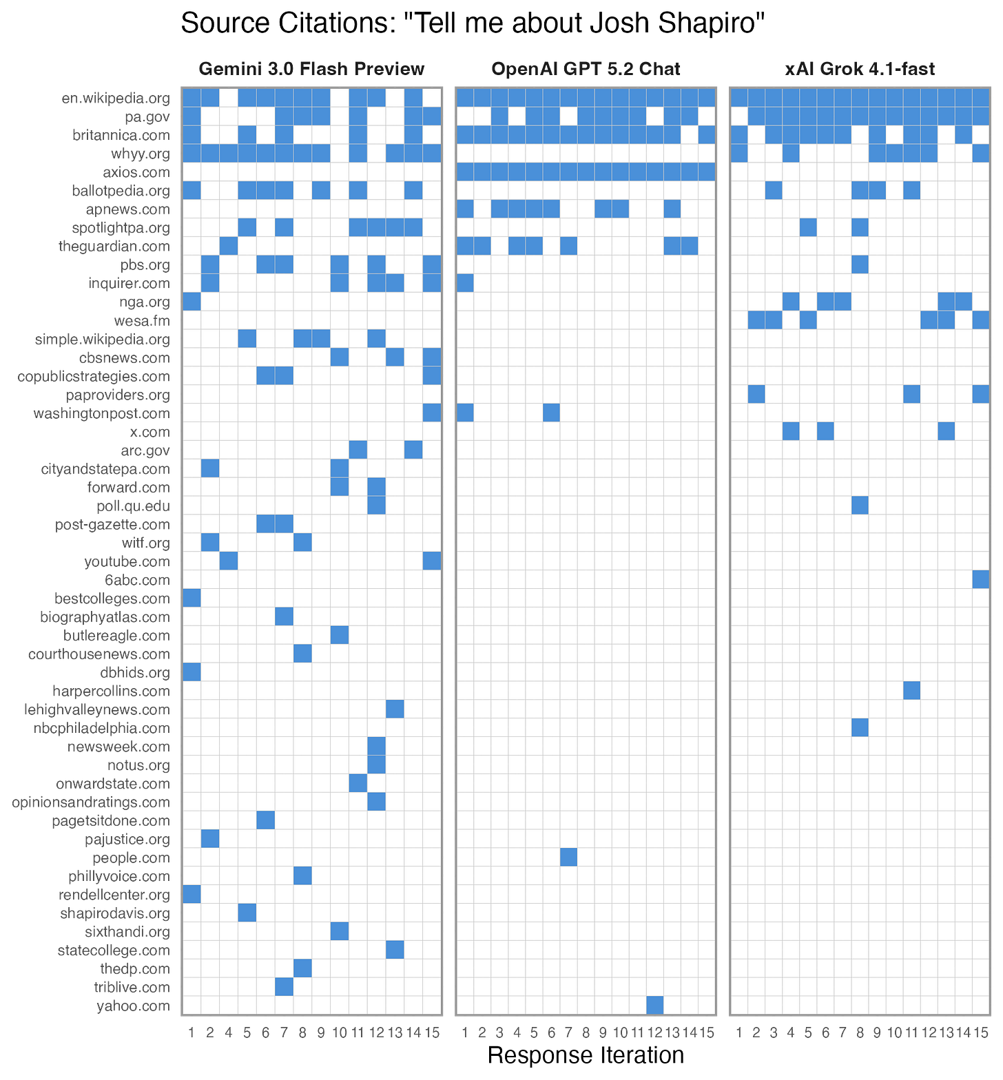 As an example, we can look at the full set of citations for Pennsylvania Governor Josh Shapiro in response to the prompt “Tell me about Josh Shapiro.”